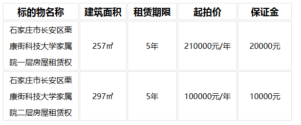 受委托,我公司定于2026年4月13日10时在河北省公共资源大厦通过冀政政务服务拍卖平台(http://www.jizheng.org.cn/TPBidder-cs/tbrweb/index)以网络拍卖方式对石家庄市长安区栗康街科技大学家属院一、二层房屋租赁权进行公开拍卖。