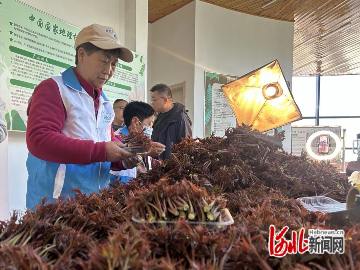 4月4日,谷家峪村的宇盛种植专业合作社,村民正在打包香椿准备发货。河北日报、河北日报客户端记者张晓超摄